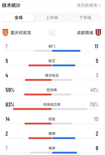 控球率方面,重庆铜梁龙为59%,成都蓉城为41%。射门次数方面,成都蓉城11比7占优,双方各有5次射正。重庆铜梁龙传球成功率为83%,成都蓉城传球成功率为76%。