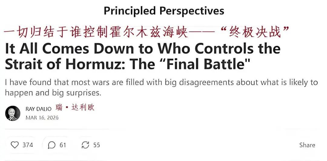 70年后的今天,一位传奇投资人、桥水基金的创始人瑞·达利欧,对着霍尔木兹海峡的滚滚波涛,发出了刺耳的预警:
