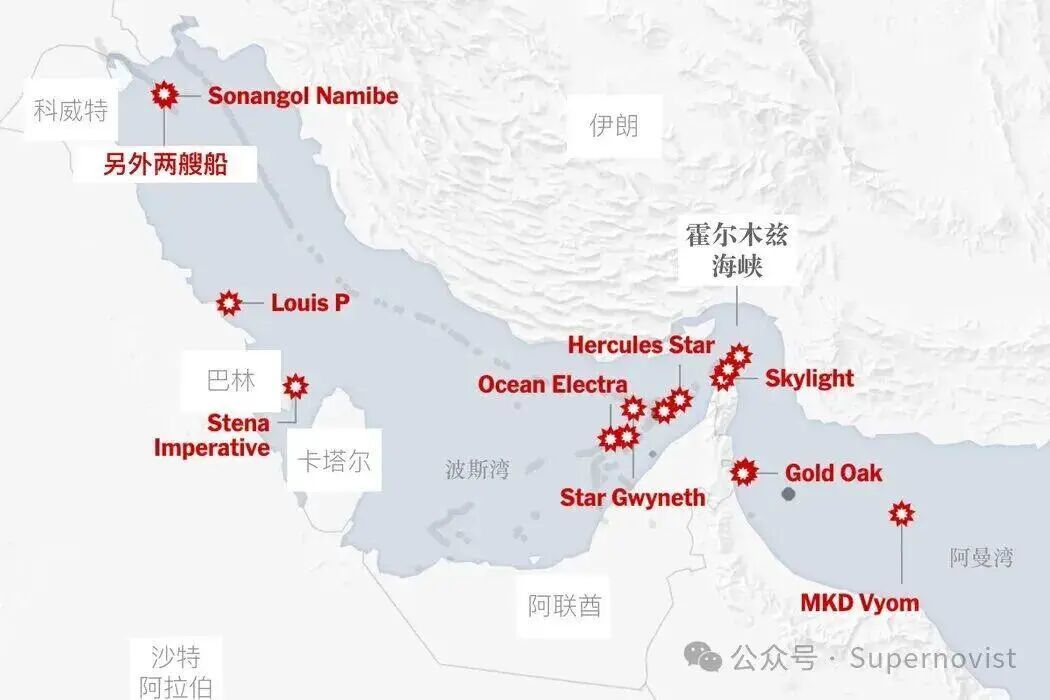 霍尔木兹海峡2月28日开战以来在其附近受袭的商船。图源:纽约时报